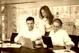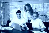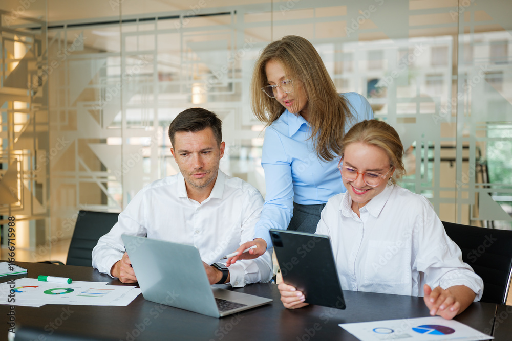 A group of colleagues engaged in collaborative teamwork within a contemporary office setting, actively participating in a strategic planning meeting