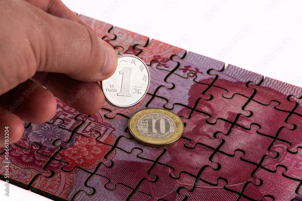 A puzzle piece of a 100 yuan bill, 10 yuan coin and a 1 yuan coin