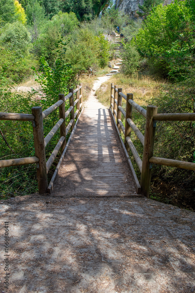 Puente de madera sobre el Río Júcar camino de la cascada del Molino de la Churrera