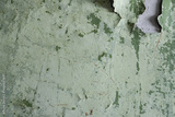 Green peeling paint on the wall. Old concrete wall with cracked flaking paint. Weathered rough painted surface with patterns of cracks and peeling. High resolution texture for background and design.