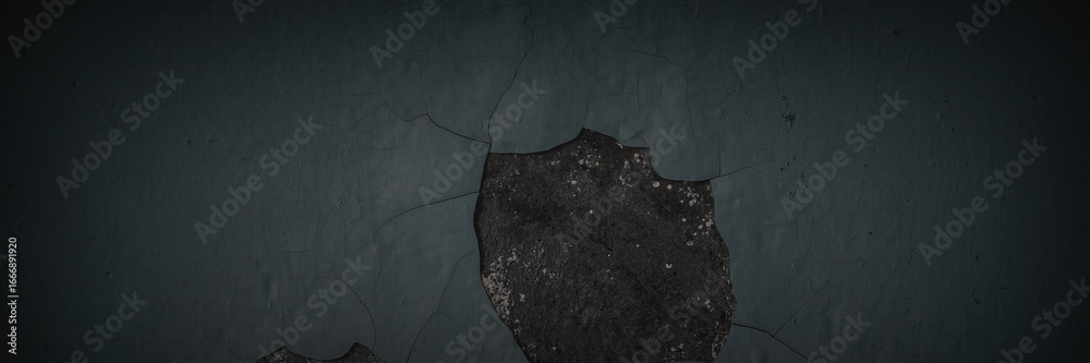 Dark wide panoramic background. Peeling paint on a concrete wall. Dark grunge texture of old cracked flaking paint. Weathered rough painted surface. Patterns of cracks. Darkness background for design.
