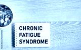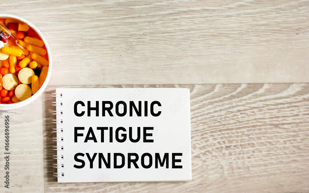 The symbol Chronic Fatigue syndrome on the notebook. White background with pills. The concept of medicine and chronic fatigue syndrome.