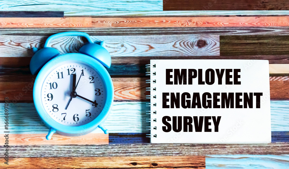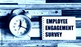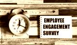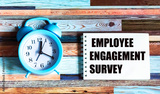 The text of the employee engagement survey on a paper card with an alarm clock on a beautiful background