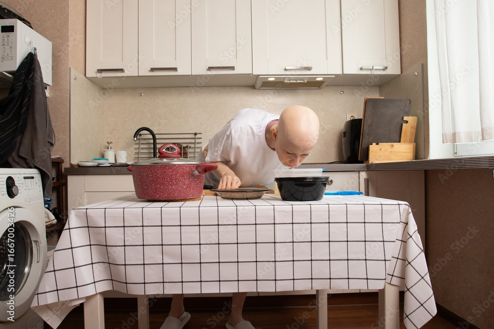 Cancer patient in kitchen preparing food and focusing on healthy nutrition during recovery process