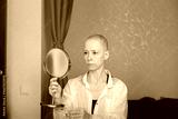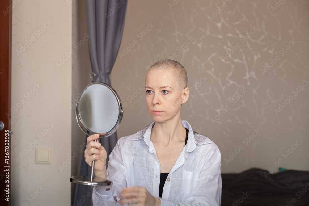 Bald Woman Looking in Mirror at Home After Shaving Head