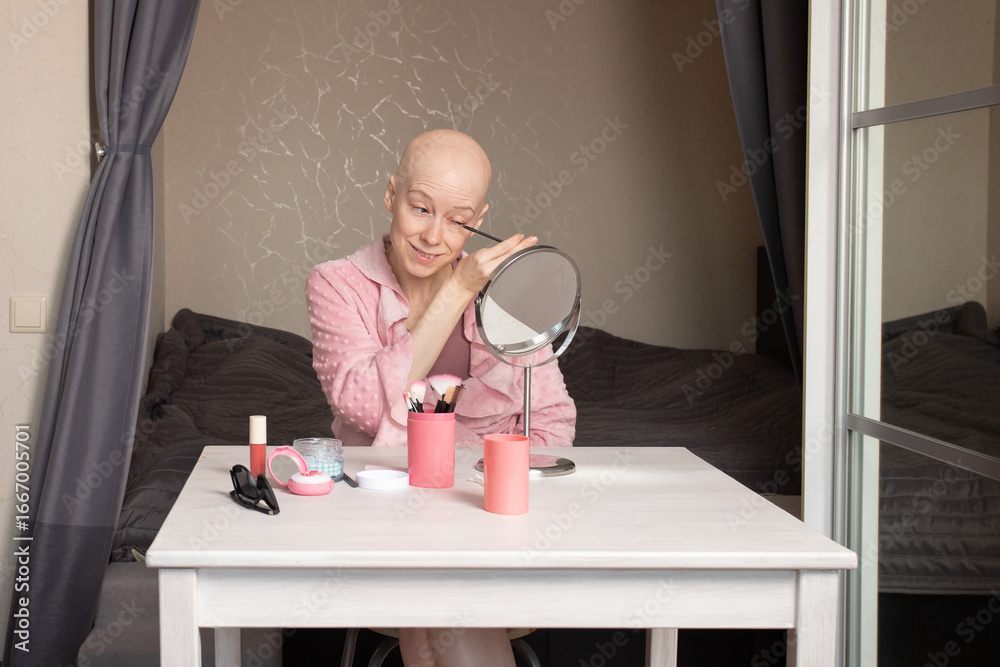 Bald woman smiling while applying makeup in front of mirror, concept of confidence, recovery and self-expression