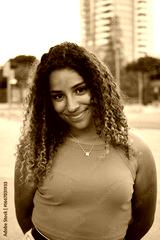Portrait of a cheerful young African American woman looking at camera with big smile, standing outdoors in a city environment. Vertical image with copy space.