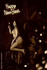 happy african woman in red dress with glass of champagne