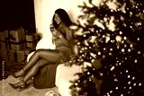 happy african woman sitting on sofa at new year with glass of wine against christmas tree background