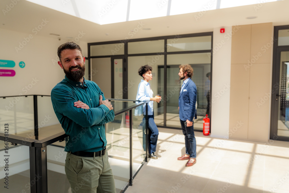 Portrait of a smiling businessman standing with crossed arms in a modern office building hall, while his colleagues are having a conversation in the background