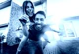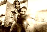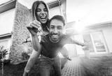 Happy young couple holding home keys after buying real estate - Husband and wife standing outside in front of their new house