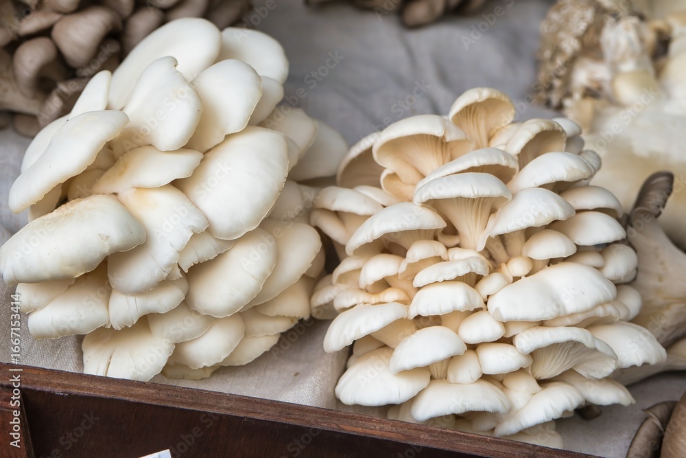 White oyster mushrooms growing in layered clusters with smooth caps.