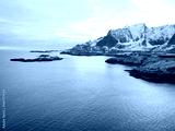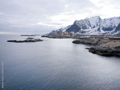 Breathtaking dramatic scene of white snow mountain against blue sky and clear water, Lofoten Islands, Norway, rock mountain, landscape snowscape background