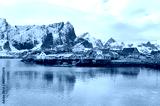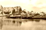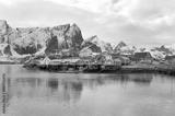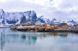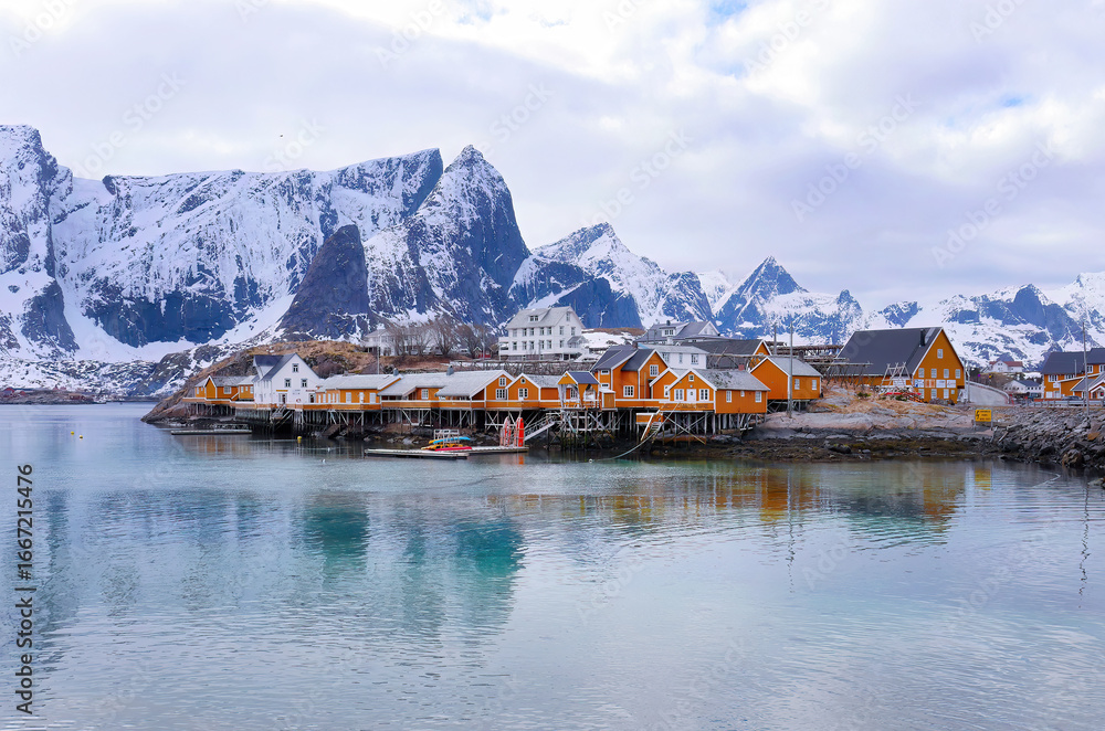 Orange color houses Village against snow Mountains, Hamnoy Sauna, Lofoten Islands, Norway, rock mountain, beautiful nature for background wallpaper or backdrop