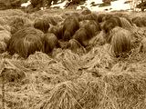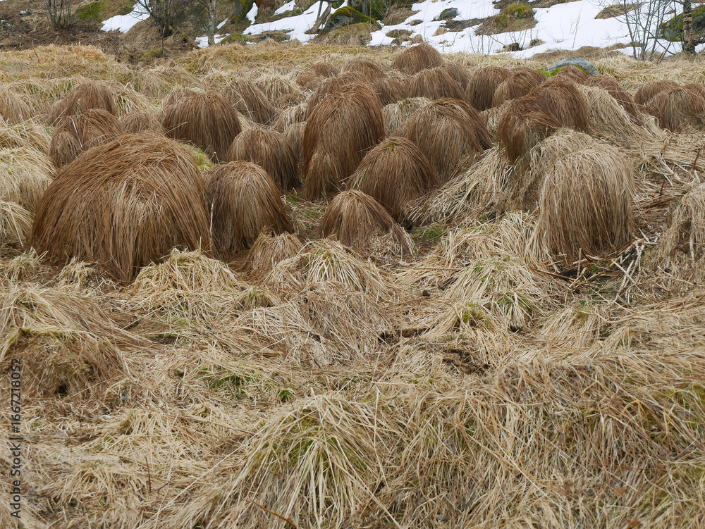 Swamp Tundra Grass, Wig shape grass field in Lofoten Norway, looking like hair, wetland National Park in Winter, Wig grass on the mountain and waterfall