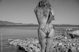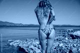 beautiful female body in pink swimming trunks. buttocks and slender legs. young woman topless on the beach back view