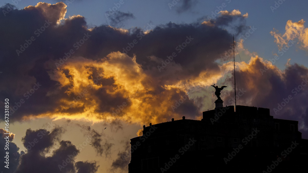 Beautiful sunset sky and clouds over Rome with Holy Angel statue silhouette