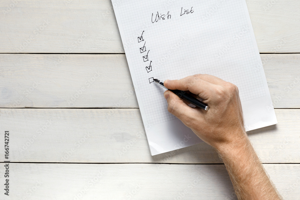 Person Filling Out Wish List, Top View. Memo Planning Strategy Process Ideas Concept