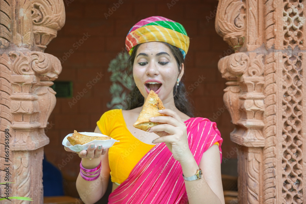 Young happy indian woman wearing sari and turban eating crispy spicy samosa street food of india.
