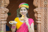 Young happy indian woman wearing sari and turban enjoy eating samosa street food of india.