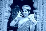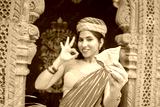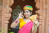 Young happy indian woman wearing sari and turban enjoy samosa street food of india.