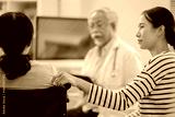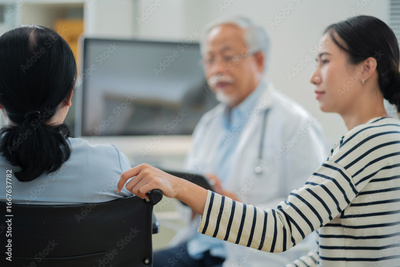 Asian daughter accompanies senior mother for medical consultation with doctor using digital health technology. Family centered care demonstrates intergenerational support and patient advocacy through