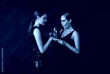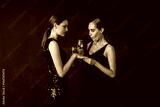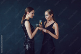 Attractive women in cocktail dresses are holding glasses of champagne, talking and smiling.
