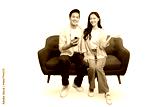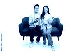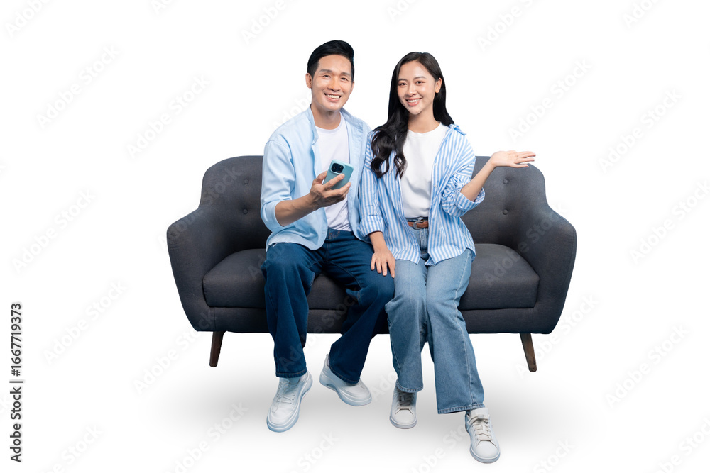 A cheerful couple on a comfortable gray sofa holding a phone and smiling against a clean background. The scene captures the modern lifestyle and ease of communication.