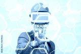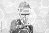 Training Development Augmented Reality Designing Building Industry Business Template concept. Man in VR glasses and hard hat presses training development button on a virtual graphical user interface.