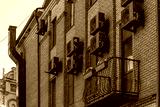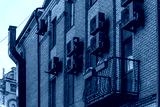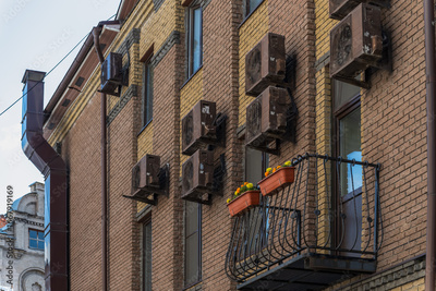 Many air conditioners on a brick wall of a house and a balcony with flowers. Selective focus.