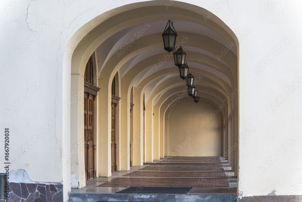Vaulted gallery with lanterns. Old shopping arcades in Kazan.