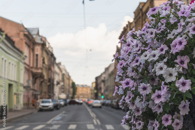 Blurred background of a city street and petunia flowers in the foreground. Flowers in the city.