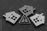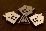 Three Miniature Houses with Warning Exclamation Sign — Real Estate Risk and Hazard Concept