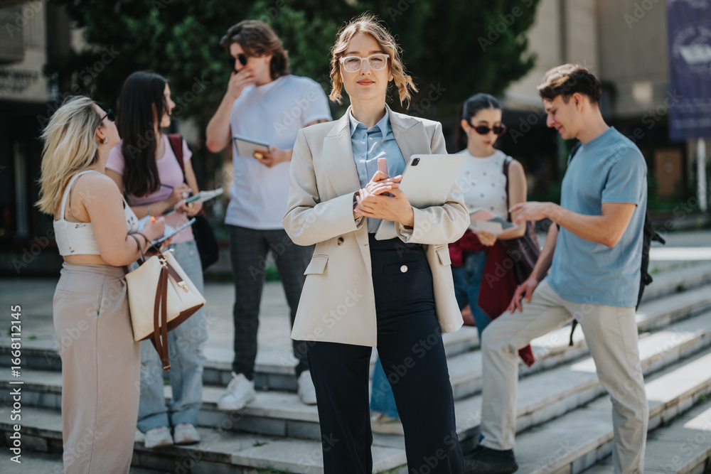 A professor engaging with a group of students on campus steps, fostering communication and collaboration.