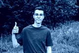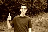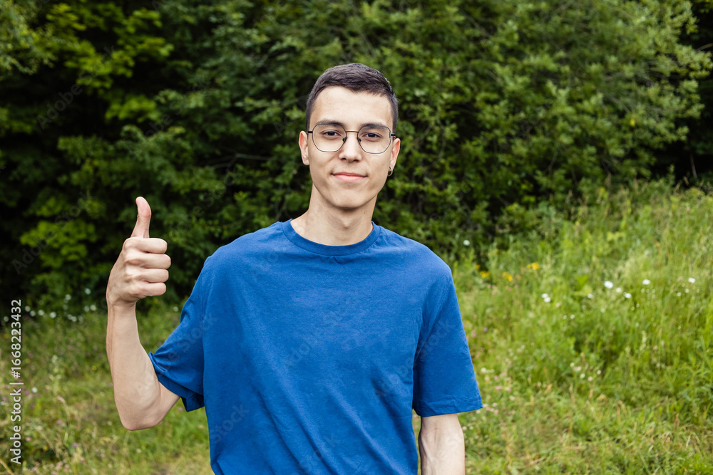 Close-up portrait of young man in glasses on summer park background, pointing finger up