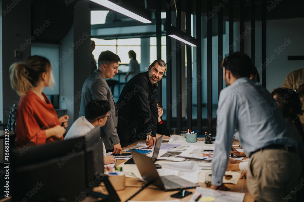 A diverse group of business colleagues gather around a table in a modern office, engaged in a lively brainstorming session. They discuss ideas, strategies, and solutions to achieve success together.