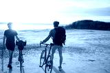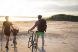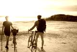 Two tourists with bicycle walking in the desert during the sunset in lake