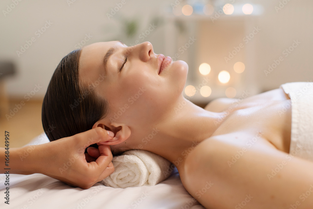 Beautiful young lady getting ear massage by professional masseuse in spa salon, woman client lying with closed eyes in relaxed atmosphere