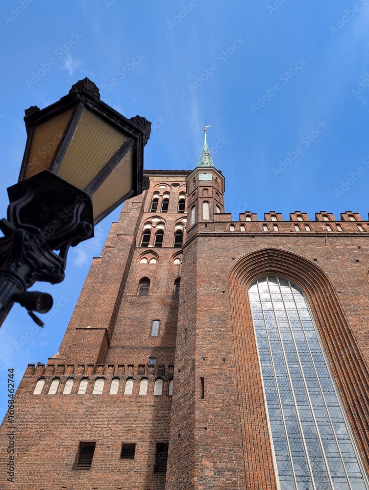 Historic brick church tower stands tall against a clear blue sky showcasing architectural beauty and craftsmanship in a European city setting