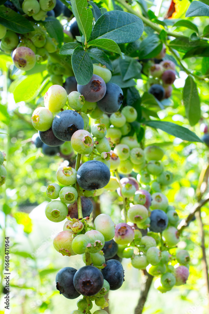 Ripe and unripe blueberries growing on a bush in summer garden