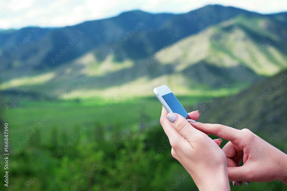 Woman's hands using mobile phone on the nature.
