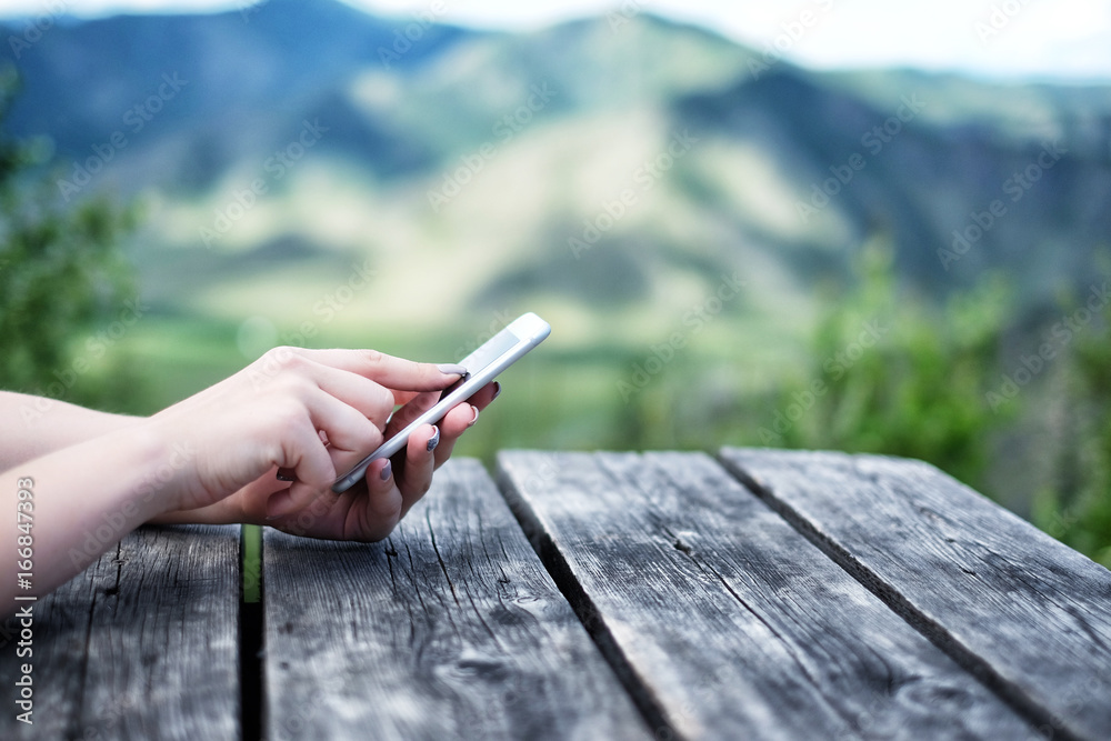 Woman's hands using mobile phone sitting at the old wooden table among the mountains.