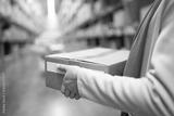 Rear view of Muslim female warehouse worker holding cardboard delivery box in warehouse