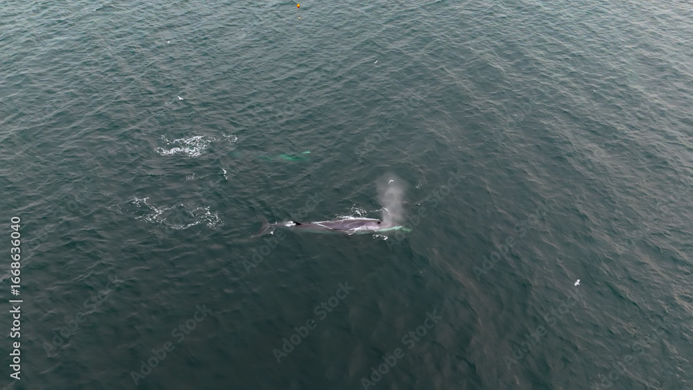 Aerial view of two fin whales, Balaenoptera physalus, hunting in Donegal Bay, Ireland