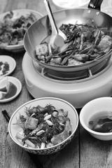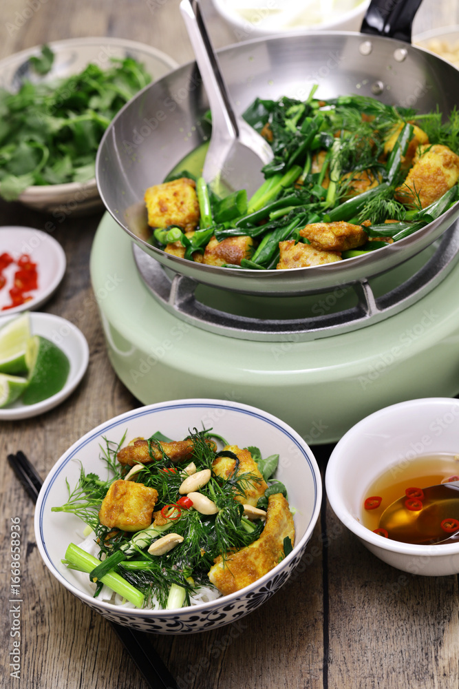fried turmeric marinated river fish with dill, homemade Vietnmese cuisine