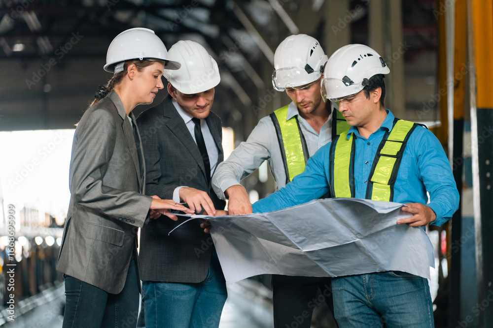 Engineers wearing safety helmets inspecting railway blueprint beside a vintage locomotive, symbolizing teamwork, innovation, and development in modern rail transportation and infrastructure projects