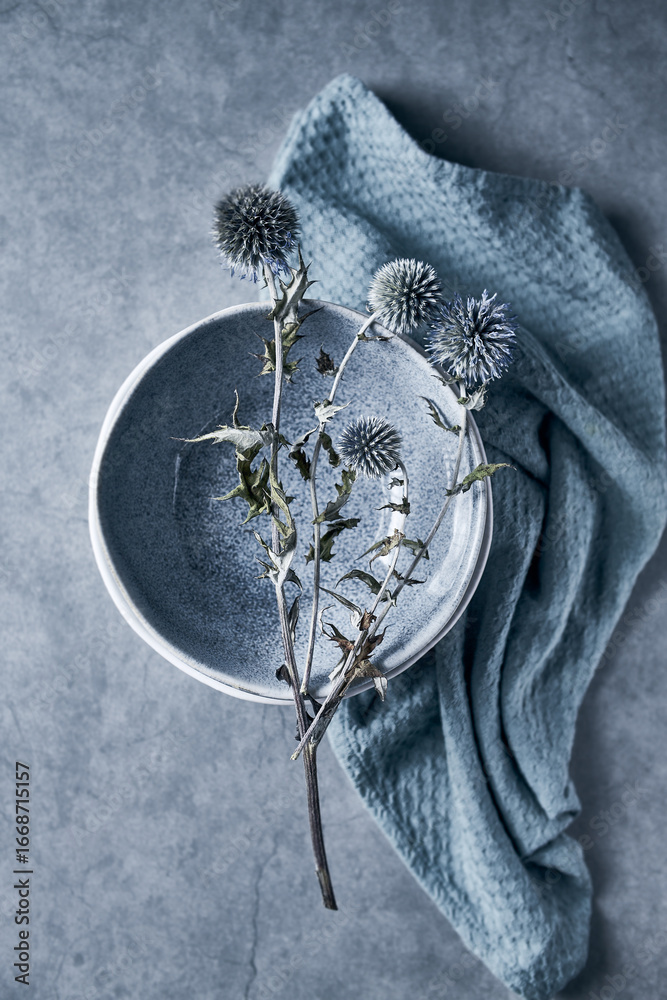 Still life with Globe Thistle and ceramic bowl. Top view