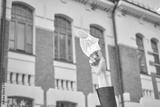 Hand holding medical mask outside brick building symbolizing end of pandemic and new beginning.
