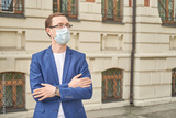 Young caucasian male wearing mask and blue jacket outdoors near building.
