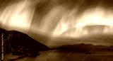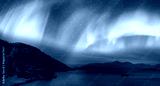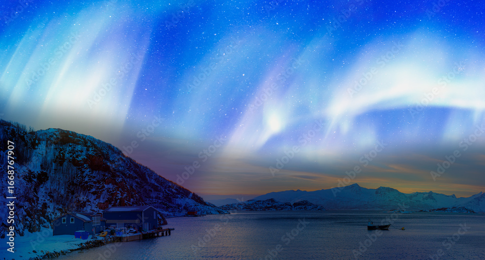 Fisher shelter in winter with fishboat aurora borealis in the background - Norwegian fjords, Norway